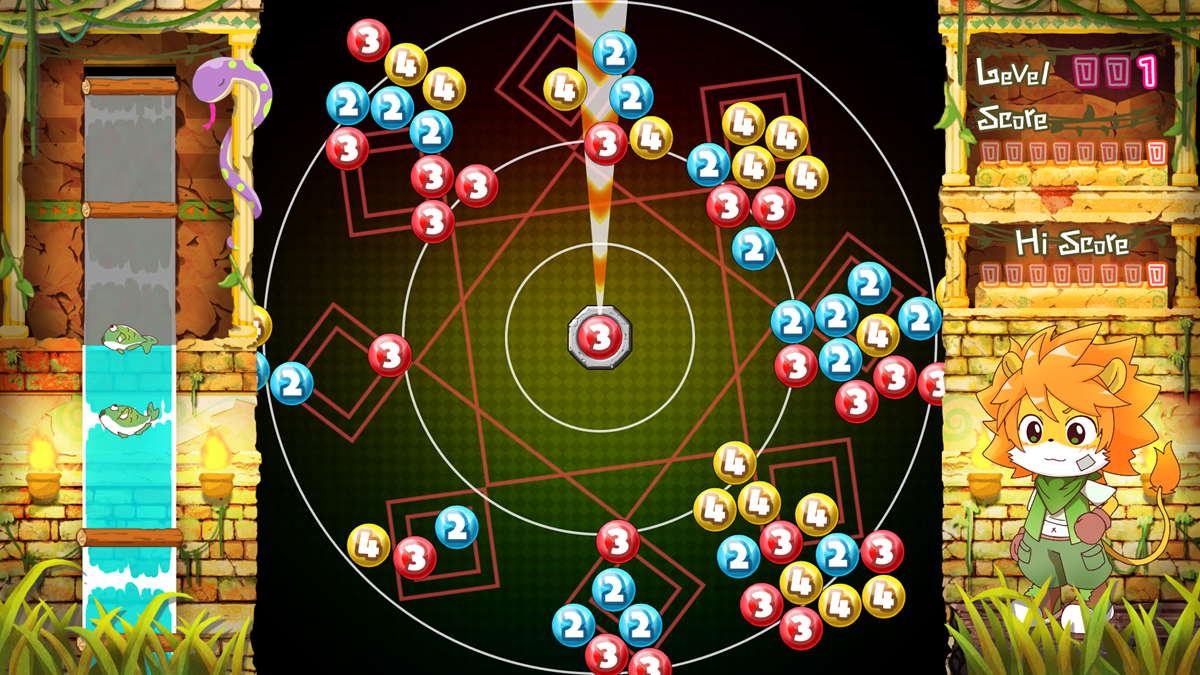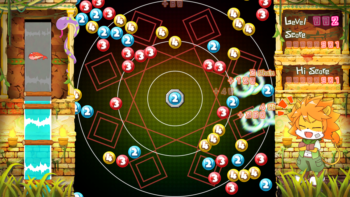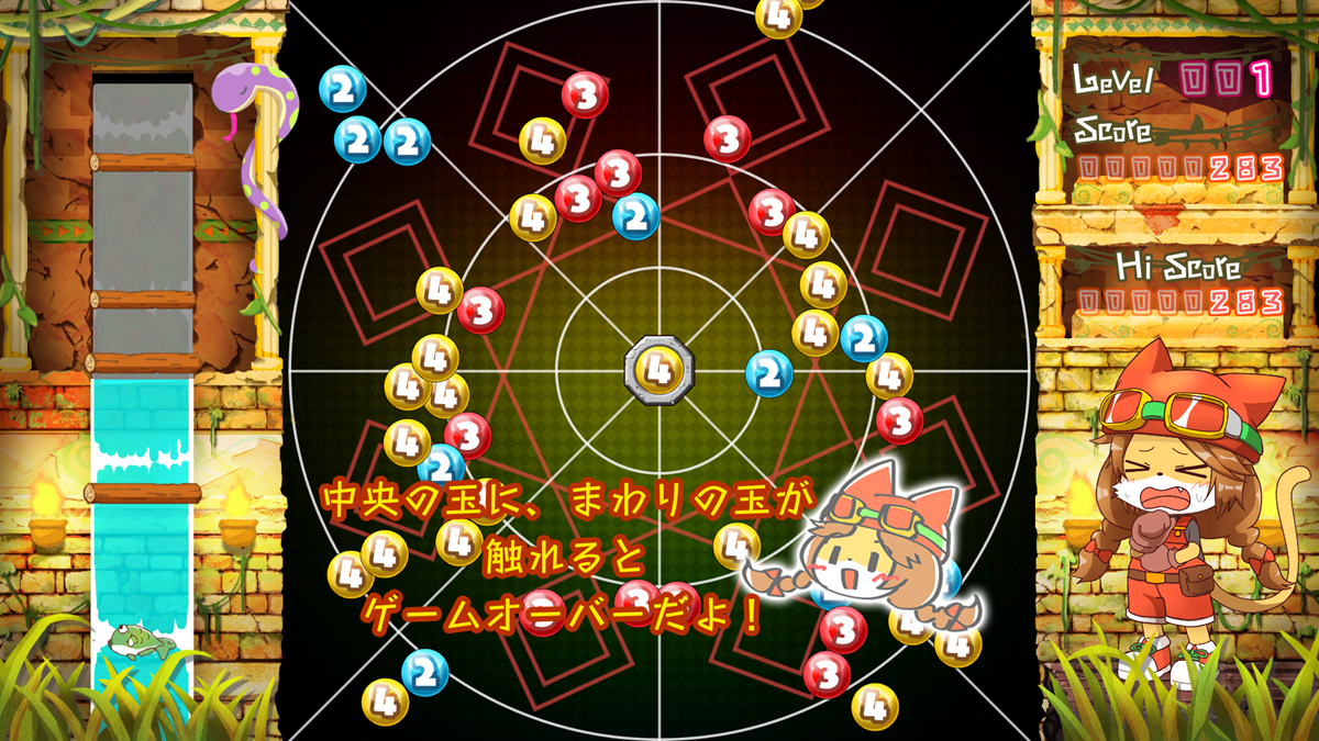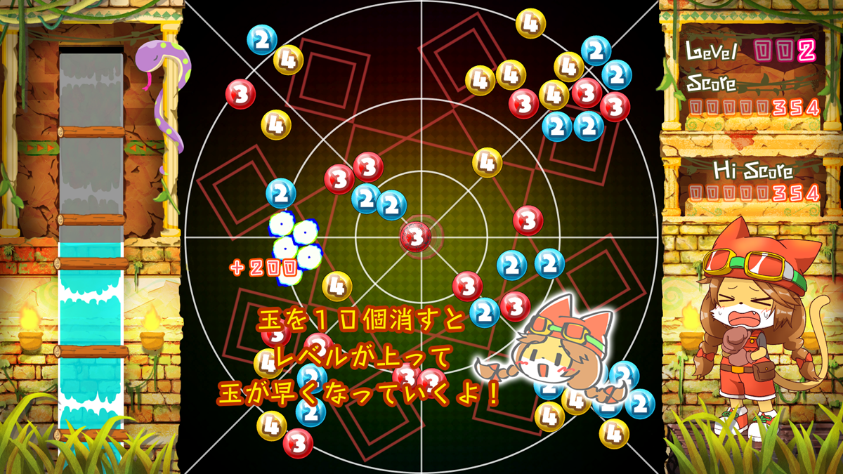 同じ数字の玉同士はくっつき、くっついた玉の個数が数字以上になると玉が消滅!玉を消すたびスピードが早くなっていくので、的確な判断と素早い操作が要求される。