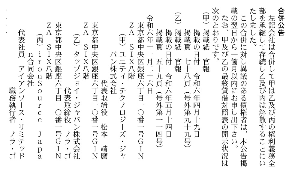 ユニティ・テクノロジーズ・ジャパンは、ironSource Japanとタップジョイ・ジャパンを吸収合併する。タップジョイ・ジャパンとironSource Japanは解散する。本日11月26日付の「官報」に掲載された「合併公告」で判明した。