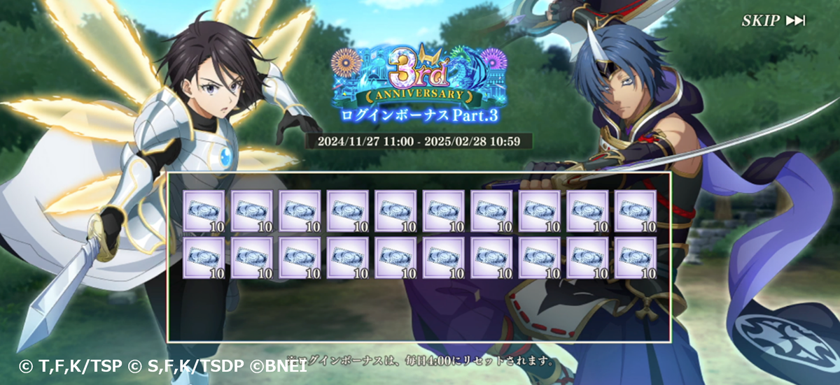 まおりゅう3周年を記念したログインボーナス第3弾を開催中!期間中にログインすると極★5入り10連スカウトチケットが毎日もらえる!ログインし続けると、最大200回分が獲得可能!