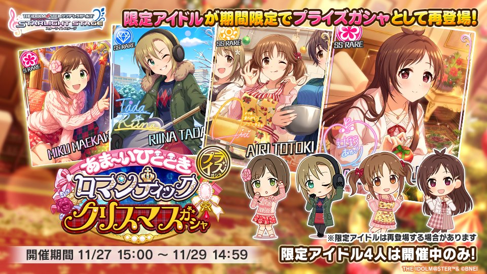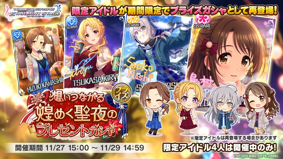 バンダイナムコエンターテインメントは、本日(11月27日)15時より、『アイドルマスター シンデレラガールズ スターライトステージ』において、過去に開催した以下3つのガシャの期間限定アイドルの「プライズガシャ」再登場を発表した。