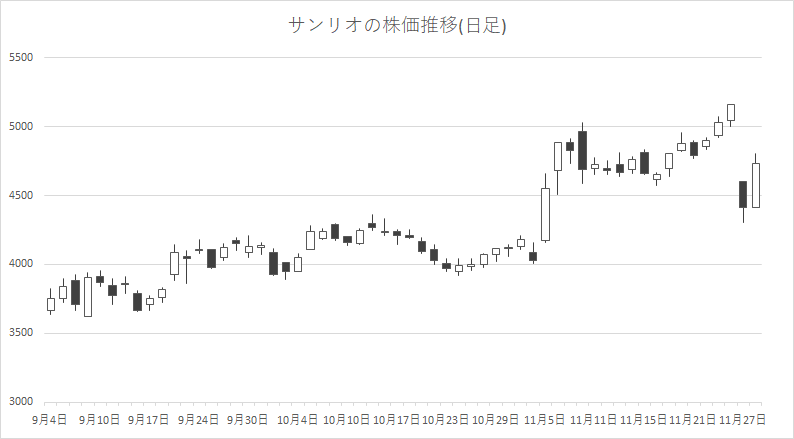 11月28日の東京株式市場では、サンリオ<8136>が大幅反発。11月27日に株式売出しの発表を受けて需給悪化懸念から売り込まれたが、売られ過ぎとの見方から自律反発狙いの買いが入ったようだ。