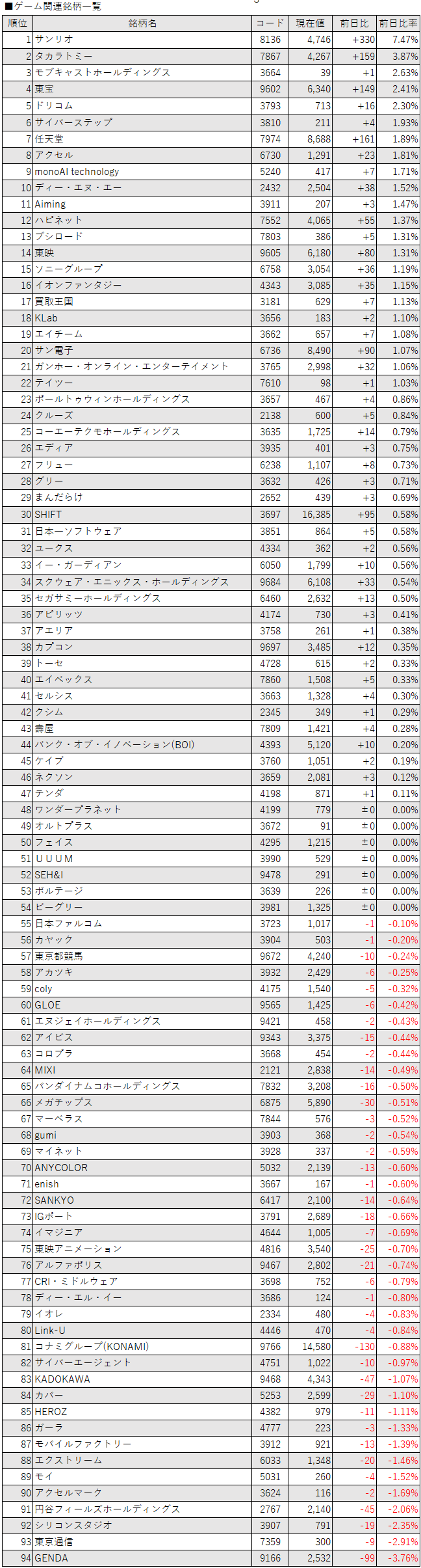 こうしたなか、ゲーム・エンタメ関連企業をみると、登録されている94銘柄のうち、上昇は47銘柄(50%)、下落は40銘柄(43%)、変わらずは7銘柄(7%)で、上昇した銘柄のほうが多かった。