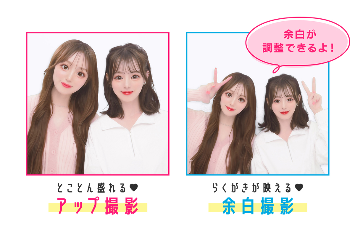 『Bépiu.(ベピウ)』、『i my merry(アイ マイ メリー)』で好評だった2つの画角で撮れる撮影モードを本作にも採用。ナチュラルで透明感のある盛りを全面に楽しめる「アップ撮影」と、らくがきが映える「余白撮影」それぞれの枚数が選べるので、盛り重視派もらくがき重視派も大満足のプリが撮れる。