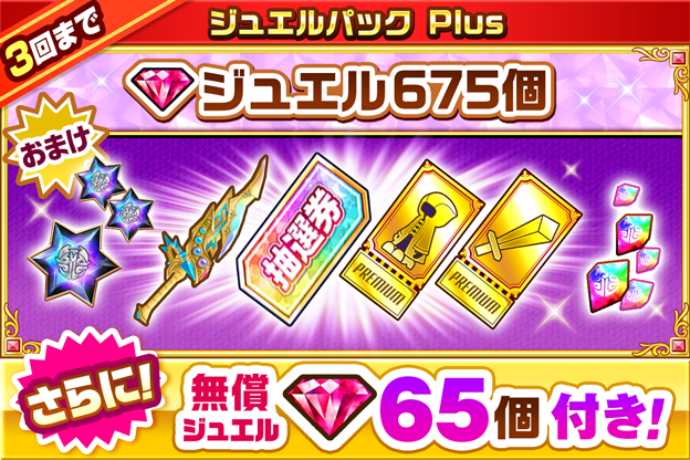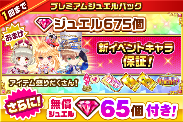 内容物:「ジュエル」675個、「無償ジュエル」65個、「新イベントキャラ保証」など
