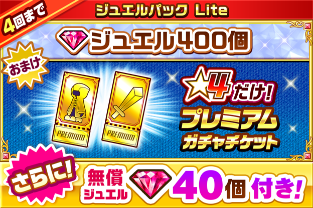 内容物:「ジュエル」400個、「無償ジュエル」40個、「プレミアムキャラガチャチケット」、「プレミアム武器ガチャチケット」