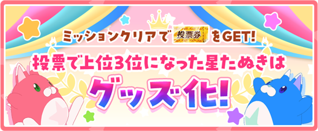 これまでの『白猫』に登場した様々な星たぬきの人気投票を開催する。対象となる星たぬきはモンスター図鑑に登録できる32匹で、上位3位に入賞した星たぬきは後日グッズ化する。タウンミッションをクリアすることで「投票券」を獲得できますので、毎日クリアして忘れずに投票に参加しよう。
