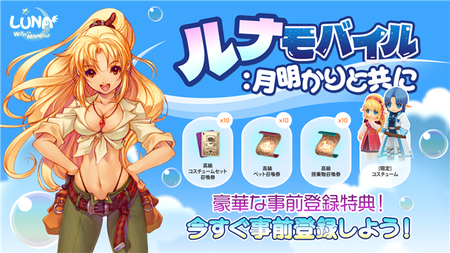 App Store、Google Play Storeや事前登録ページより事前登録をすると、事前登録報酬として、限定コスチュームやゲーム内の高級ペットやアイテムやを召喚できる召喚券3種を各10枚プレゼント。