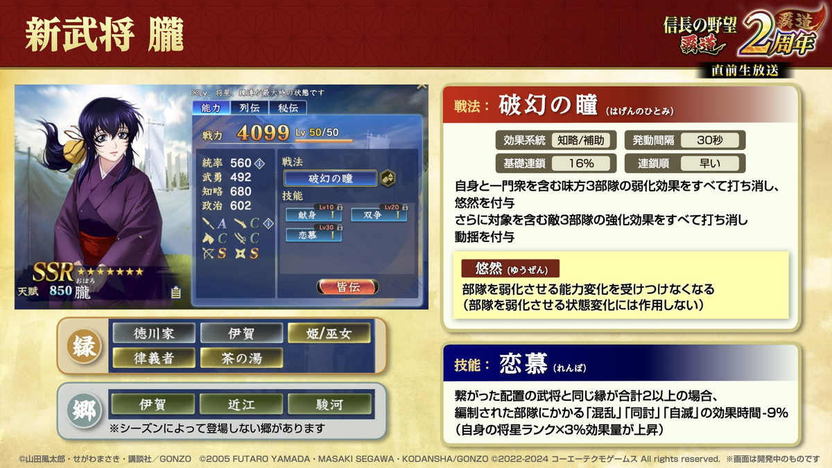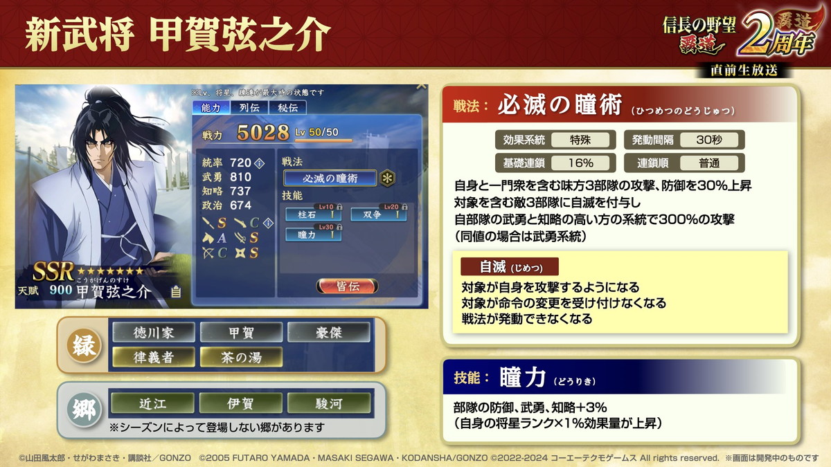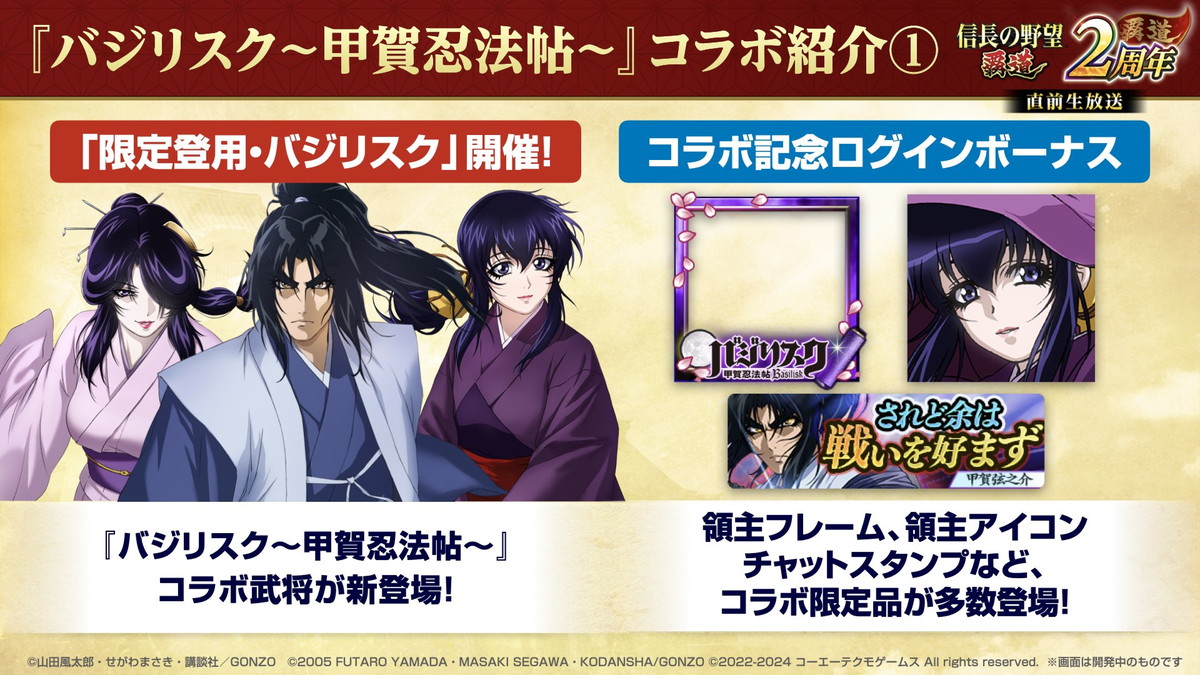 今回のイベントでは、「甲賀弦之介」、「朧」などの『バジリスク~甲賀忍法帖~』でおなじみの武将が登場する限定ガチャ「限定登用・バジリスク」のほか、領主フレームや領主アイコン、チャットスタンプなどのコラボ限定品が手に入るコラボ記念ログインボーナスが開催中。