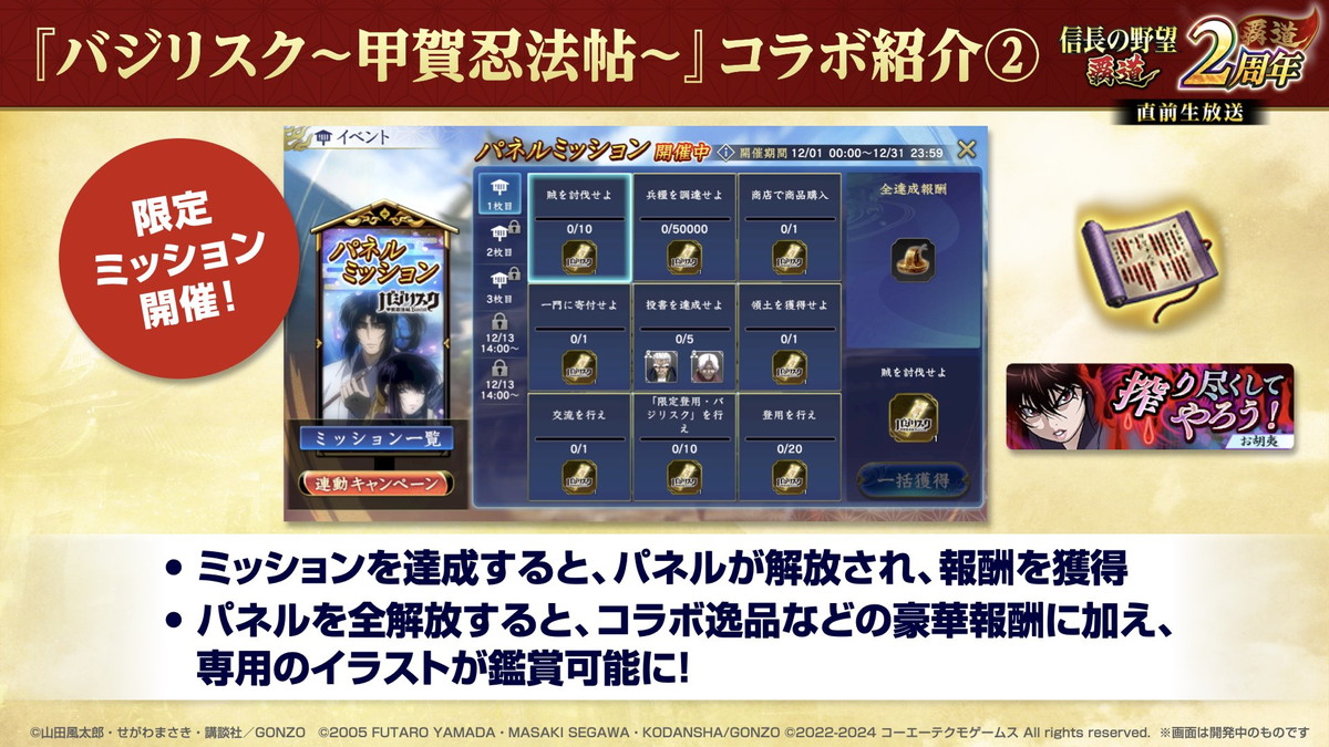 本キャンペーンについては、12月1日から開始する『信長の野望 覇道』ゲーム内の「パネルミッション・バジリスク」で3枚目のパネルを全達成することで参加ができる。