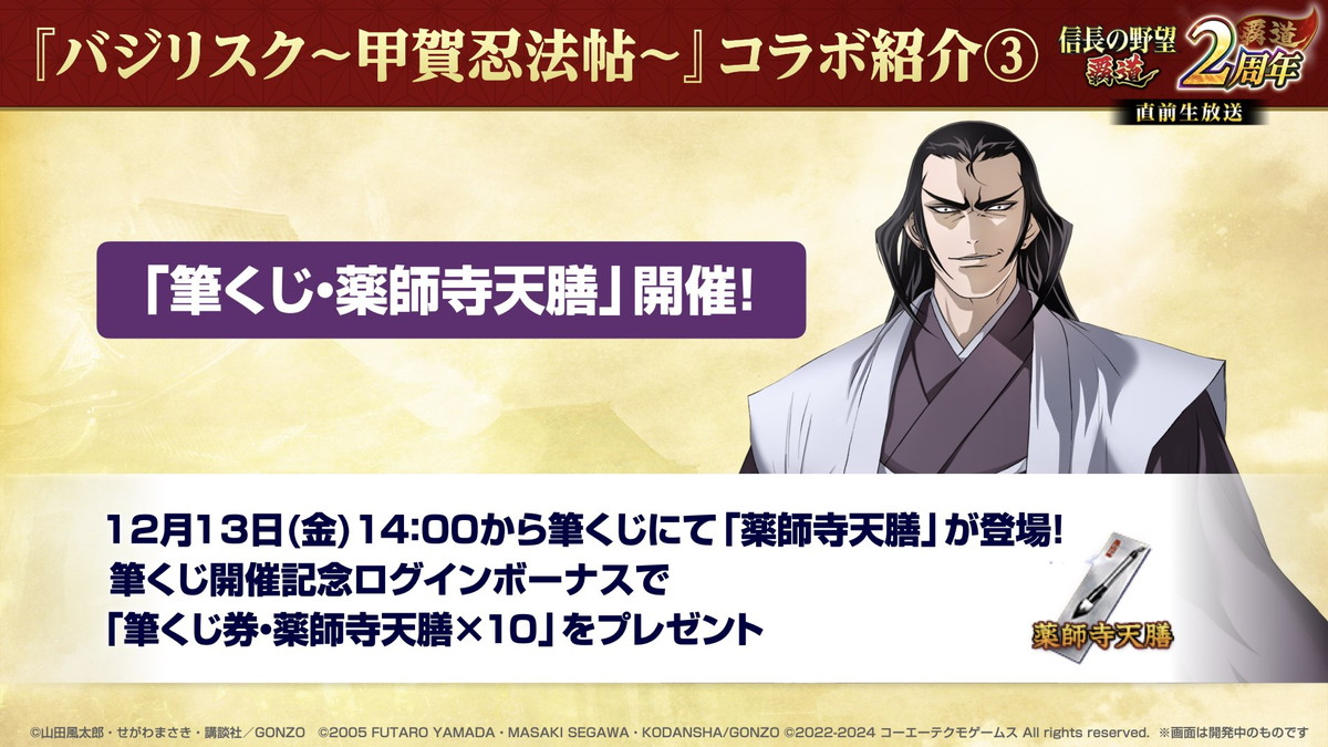 さらに、2周年と『バジリスク~甲賀忍法帖~』とのコラボを記念して、12月1日から12月31日23:59まで810(ハドウ)名に豪華賞品が当たる「2 周年コラボ記念還元キャンペーン」を開催中。