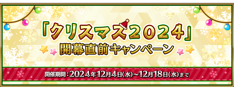 2024 年 12 月 11 日(水) 18:00 より開幕を予定している「クリスマス 2024」にあわせて、『「クリスマス 2024」開幕直前キャンペーン』を開催する。