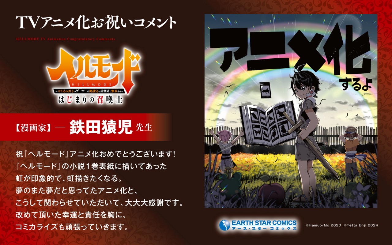 アース・スター エンターテイメントは、アース・スターノベルで刊行中のノベルが原作で、現在コミック アース・スターでコミック連載中のシリーズ累計160万部突破の人気作品 『ヘルモード ~やり込み好きのゲーマーは廃設定の異世界で無双する~』 (原作:ハム男・藻 漫画:鉄田猿児)のアニメ化を本日発表した。