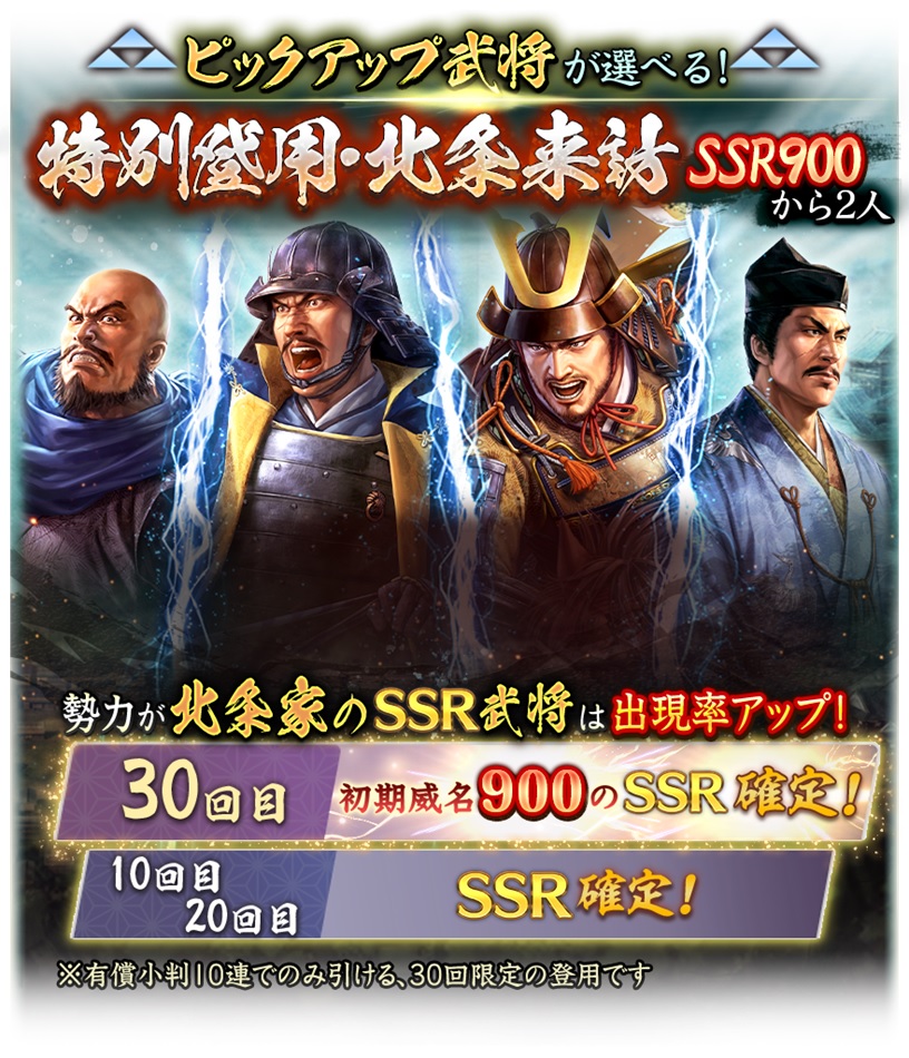 来訪イベント 第9期「北条家」では「来訪者」として北条家の重臣「北条綱成」「多目元忠」が登場する。来訪者からの依頼を積極的に達成して「来訪金貨」を集め、各種「技巧の巻」などのアイテムと交換したい。