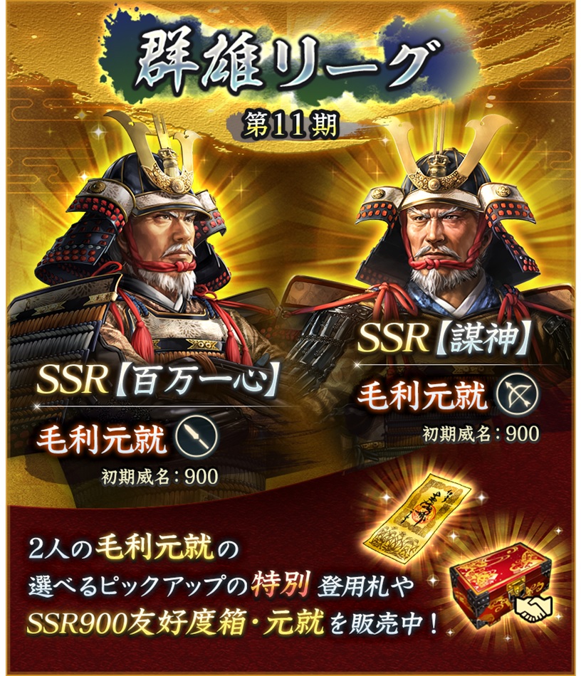 さらに、「群雄リーグ 第 11 期」の参加準備期間を開始した。今回の群雄リーグのテーマは「毛利家」。「勢力」が毛利家の武将を編成すると、威名アップのボーナスが発生する。あわせて SSR【00万一心】毛利元就や【謀神】毛利元就がピックアップされる「特別登用・群雄 第 11 期」も開催している。
