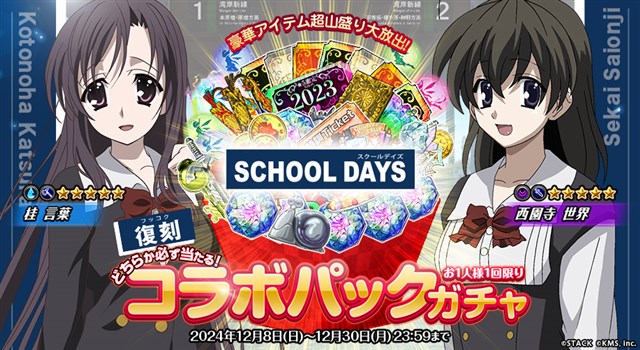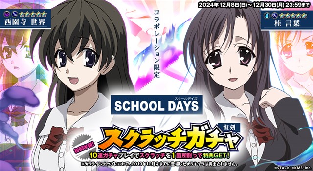 内容:School Daysの「★5桂 言葉」、「★5西園寺 世界」が仲間になるガチャになる。