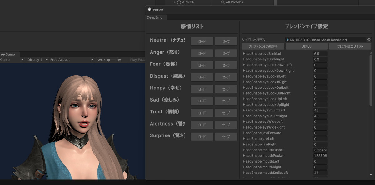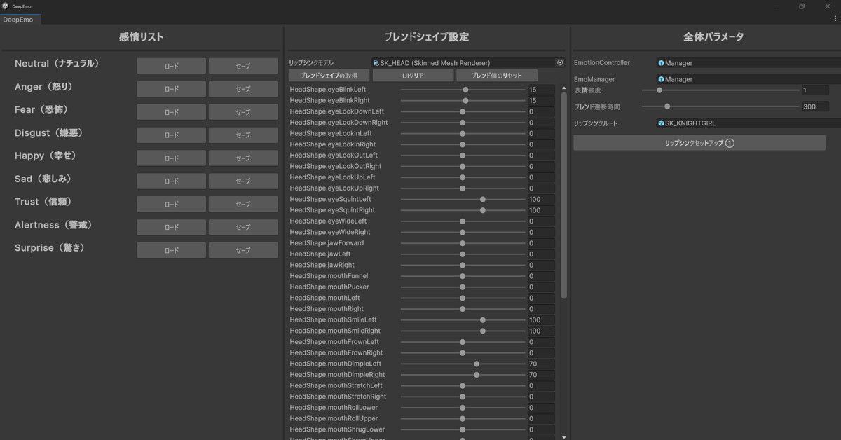 表情生成の基本となる9種類の感情(平常、怒り、恐怖、嫌悪、喜び、悲嘆、信頼、興味、驚き)に対応するブレンドシェイプをプリセットとして登録することで、台詞の感情に合わせたリップシンク付きの自然な表情アニメーションを生成する。