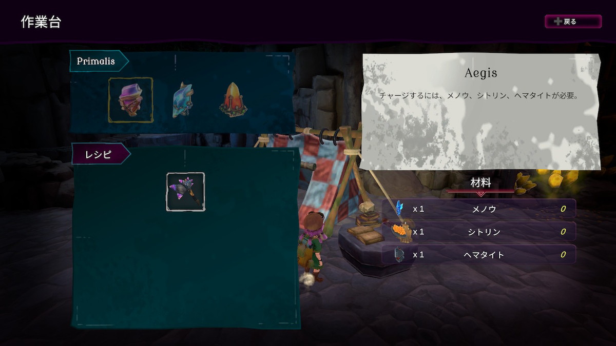 周囲の資源を集めて、道具やポーション、アップグレードを作成し、旅をサポートする。