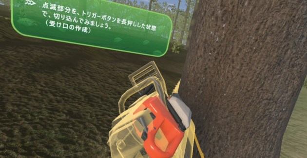 森林での伐採作業をリアルに体験学習できるコンテンツとなっており、「チュートリアルモード」「体験学習モード」「チャレンジモード」の3種類のモードがあり、初めてでも気軽に楽しみながら学習ができる仕様となっている。体験学習モードでは実際にプロが伐採している様子を撮影したVR動画を視聴することができ、プロの現場作業をその場にいるようなリアルな視点で視聴体験ができる。