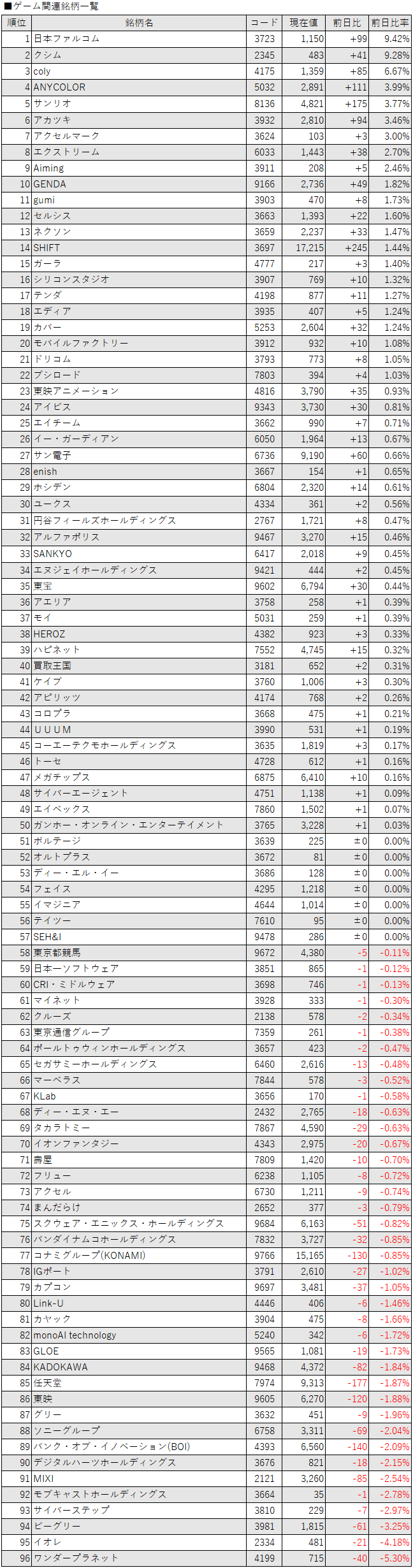 こうしたなか、ゲーム・エンタメ関連企業をみると、登録されている96銘柄のうち、上昇は50銘柄(52%)、下落は39銘柄(41%)、変わらずは7銘柄(7%)で、上昇した銘柄のほうが多かった。中小型株物色の流れも影響したようだ。