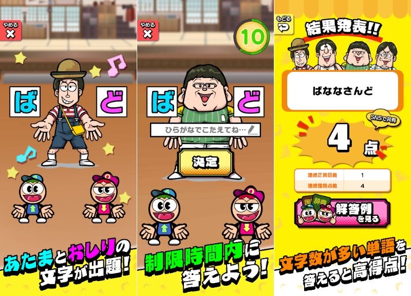 「あたまおしりゲーム」は、出題される「“あたま”の文字」と「“おしり”の文字」を聞いて、あたまの文字とおしりの文字が一致する、より多くの文字数を持つ単語を制限時間内に答えるゲームとなっている。