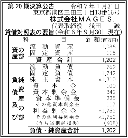 コロプラの100%子会社であるMAGES.の2024年9月期の決算は、売上高27億7500万円(前の期比25.8%減)、経常損失3億4900万円(前の期は7200万円の損失計上)、最終損失6億0800万円(同7300万円の損失計上)だった。13億1000万円の債務超過となっている。