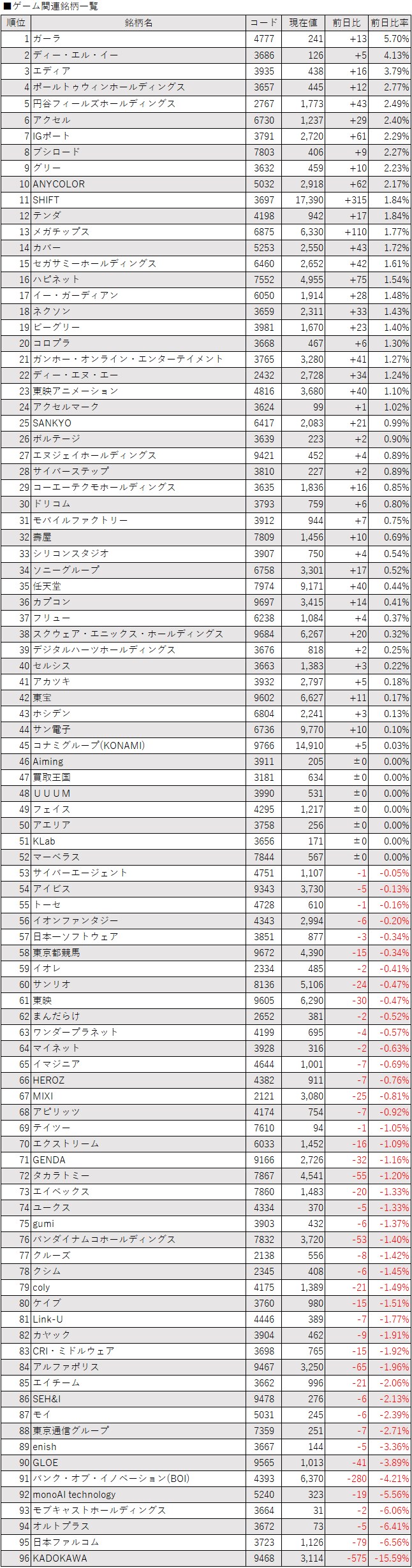 そうした中でゲーム・エンタメ関連株の動きを見てみると、下記の表に登録しているゲーム・エンタメ関連企業96銘柄のうち、上昇は45銘柄(47%)、下落は44銘柄(46%)、変わらずは7銘柄(7%)で、上昇と下落がほぼ拮抗する結果となった。