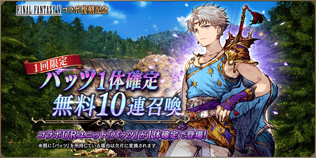 『FFⅤ』コラボ復刻の開催を記念して、コラボ UR ユニット「バッツ」が 1 体確定で登場する、1回限定の無料 10 連召喚を楽しめる。