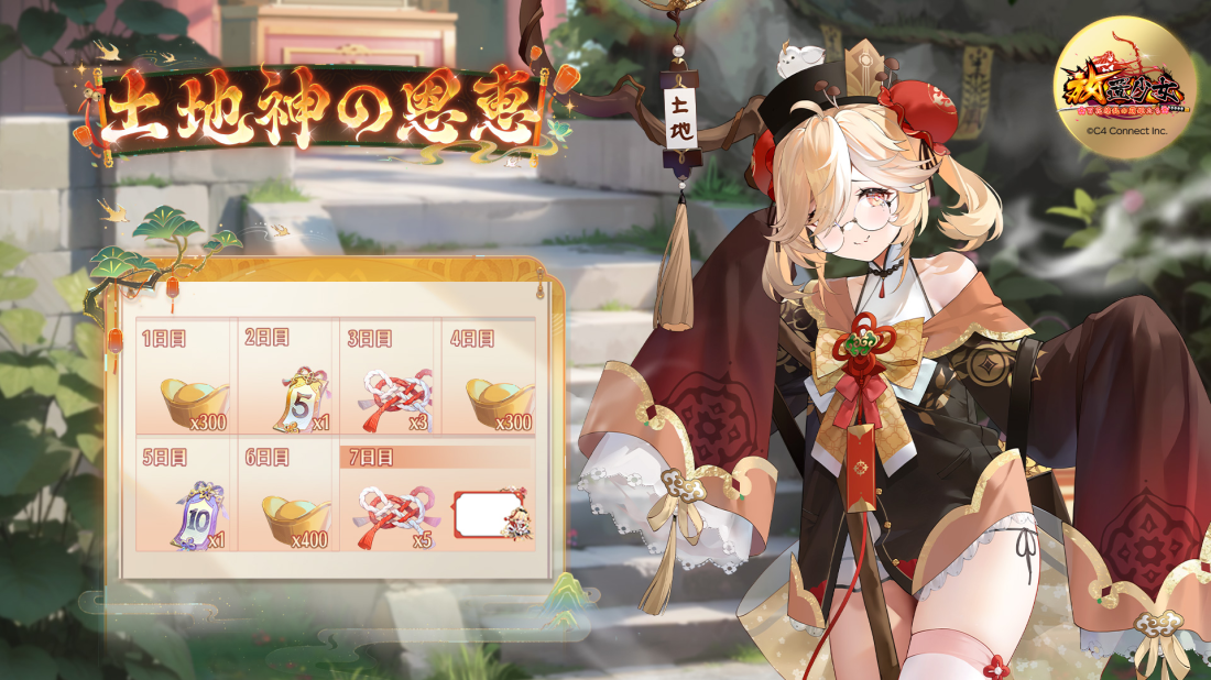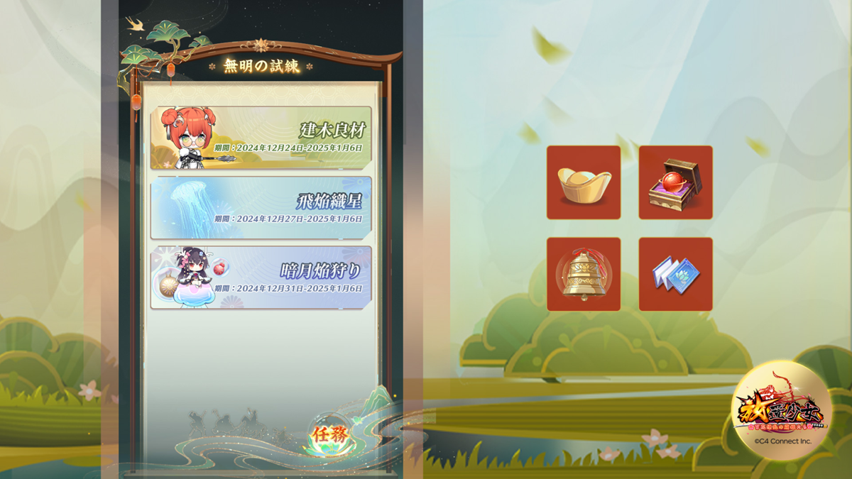 開催期間中、ゲームにログインすると元宝や高速戦闘券、絆の水引、花の水引、チャットバブルなどの報酬を獲得できる。