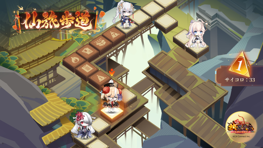 仙旅歩道では三角サイコロを投げて進むことで様々なイベントが発生し、イベントの種類により報酬は異なる。探索の最中に采薇と出会うと、綱引き形式の勝負が始まる。様々なイベントをクリアして報酬を獲得しよう。
