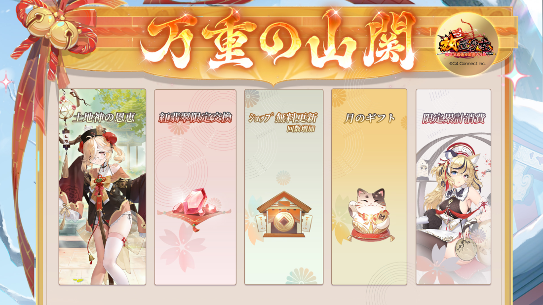 『土地神の恩恵』『紅翡翠限定交換』『ショップ無料更新回数増加』『月のギフト』『限定累計消費』など、盛りだくさんのイベントを用意している。