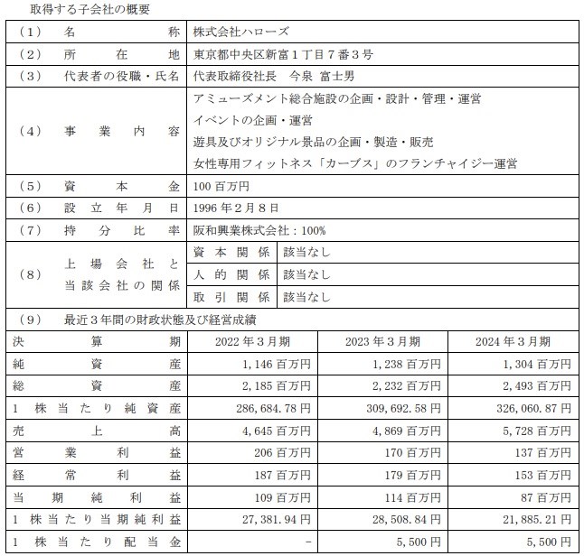 GENDA<9166>は、本日(12月24日)、連結子会社のGENDA GiGO Entertainmentがアミューズメント施設事業などを行うハローズの発行済株式の100%を阪和興業<8078>から2025年3月1日付で取得し、子会社化することを発表した。取得価額は非開示。