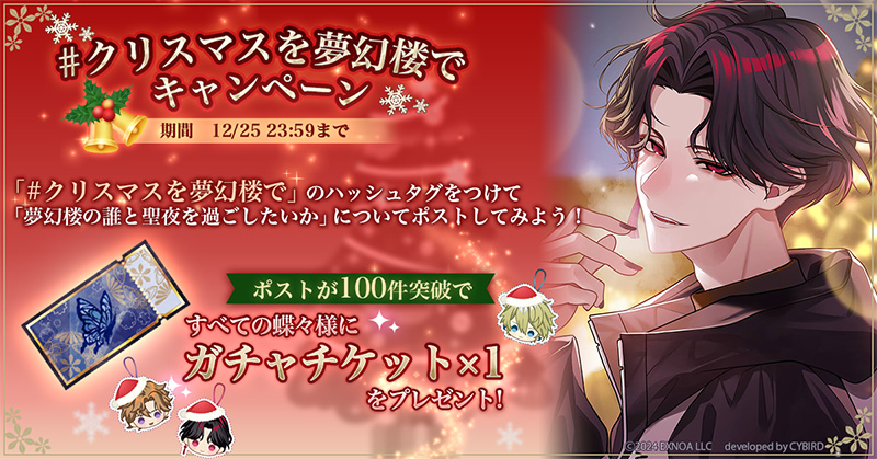 EXNOAは、女性向け恋愛ゲーム『夢幻楼と眠れぬ蝶』において、12月26日より期間限定クリスマスボイス付きシナリオの販売を開始した。