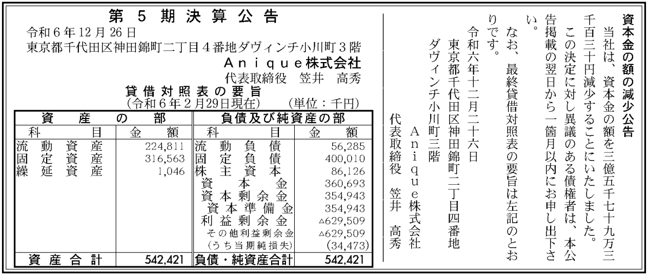 Aniqueが減資を行うことがわかった。本日12月27日付の「官報」に掲載された「資本金の額の減少公告」によると、資本金を3億5000万円減らすとのこと。