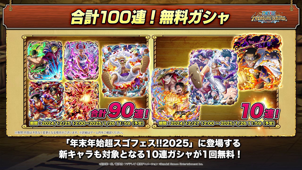 バンダイナムコエンターテインメントは、本日(12月27日)より、『ONE PIECE トレジャークルーズ』において、超スゴい「ルフィ」「サボ」「白ひげ&エース」が登場する「年末年始超スゴフェス!!2025」を開催することを発表した。