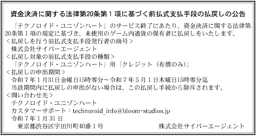 サイバーエージェント<4751>は、本日(12月27日)、『テクノロイド ユニゾンハート』のサービスを2025年1月31日15時をもって終了することを発表した。