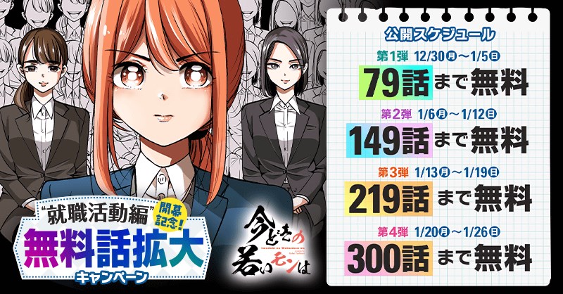 Cygamesは、マンガ配信サービス「サイコミ」で連載中の漫画「今どきの若いモンは」の新章“就職活動編”の開幕を記念して、本日(12月30日)から2025年1月26日の期間限定で最大300話分を無料公開することを発表した。