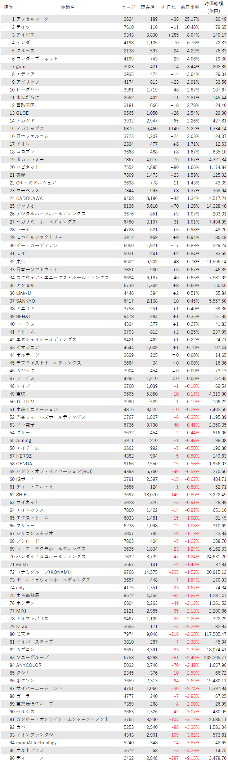 個別銘柄では、アクセルマーク<3624>やテイツー<7610>、アイビス<9343>、テンダ<4198>が買われた一方、ディー・エヌ・エー<2432>、オルトプラス<3672>、monoAI technology<5240>、イオンファンタジー<4343>が売られた。