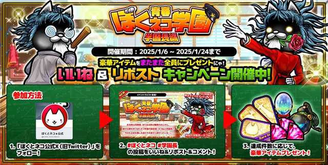 2. @IGNM_BOKUNEKO「#ぼくとネコ #学園長」が付いた投稿をいいね&リポスト!