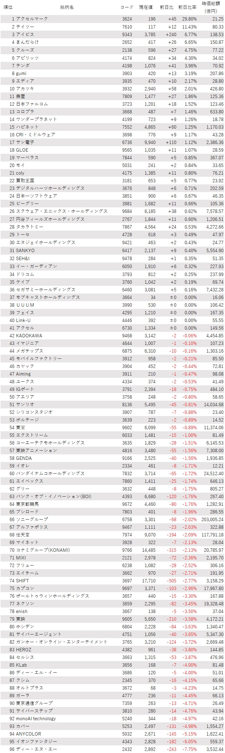 そうした中でゲーム・エンタメ関連株の動きを見てみると、下記の表に登録しているゲーム・エンタメ関連企業96銘柄のうち、上昇は36銘柄(38%)、下落は55銘柄(57%)、変わらずは5銘柄(5%)で、下落した銘柄が多かった。