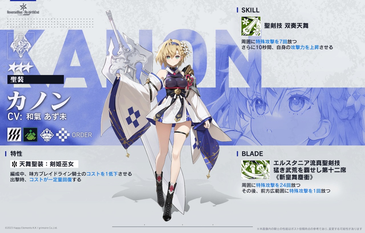 Happy Elementsは、スマートフォン向けゲーム『リバースブルー×リバースエンド』で、本日1月6日16時より新限定騎士「カノン《聖装》」をピックアップした契約を開始した。また、イベント『天に煌めく聖剣は竜の心に恋をする』において「EX クエスト」を追加した。