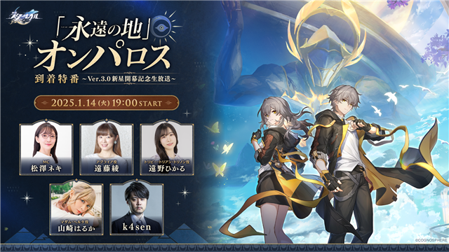 HoYoverseは、『崩壊:スターレイル』において、1月14日19:00より『「永遠の地」 オンパロス到着特番~Ver.3.0新星開幕記念生放送〜』を配信予定であることを発表した。豪華ゲスト陣が出演する生放送にて、最新情報や実機プレイなど盛りだくさんな内容をお届けする。