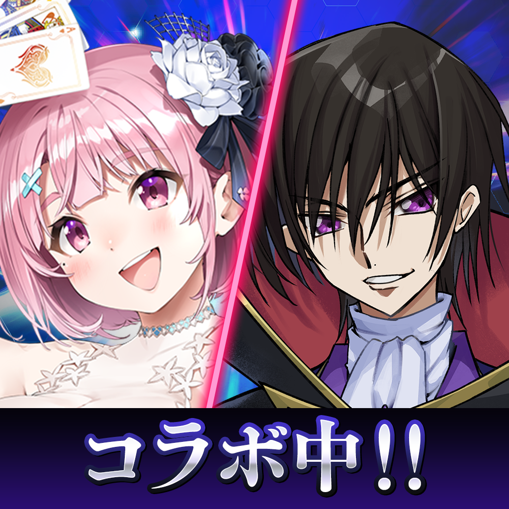 コラボ開催期間中に「ルルーシュ・ランペルージ (CV:福山潤)」、 「枢木スザク(CV:櫻井孝宏)」、 「ジェレミア・ゴットバルト(CV:成田剣)」、「C.C.(CV:ゆかな)」、「紅月カレン(CV:小清水亜美)」、「ナナリー・ランペルージ(CV:名塚佳織)」が登場するスロットを開催する。