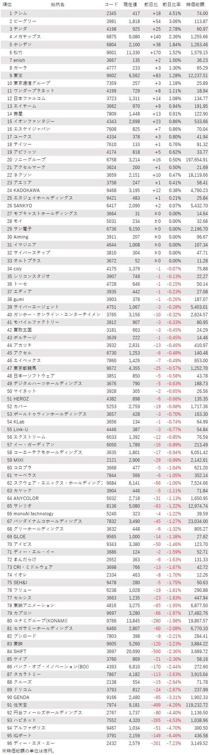そうした中でゲーム・エンタメ関連株の動きを見てみると、下記の表に登録しているゲーム・エンタメ関連企業96銘柄のうち、上昇は26銘柄(27%)、下落は63銘柄(66%)、変わらずは7銘柄(7%)で、下落した銘柄が多数を占めた。