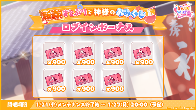 本日1月21日より、「新春!すとぷりと神様のおみくじ 応援イベント ログインボーナス」を実施中。開催期間中に7日間ログインすると、「期間限定スキップチケット」900枚を最大7回、合計で6,300枚獲得できる。