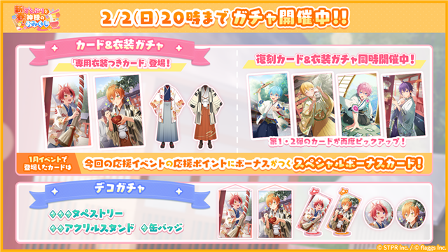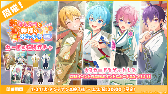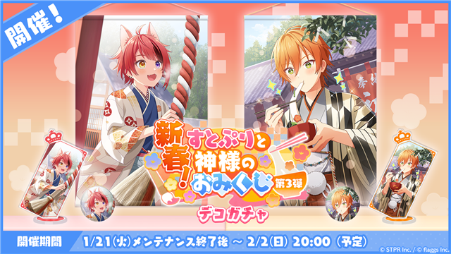 flaggsとSTPRは、2.5次元アイドルグループ「すとぷり」の公式ゲームアプリ『すとぷりWith!!(通称:すとうぃず)』において、ゲーム内イベント「新春!すとぷりと神様のおみくじ 応援イベント」を開催することを発表した。