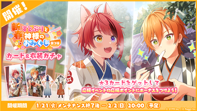 本日1月21日より、新たな★3カードがピックアップ登場する「新春!すとぷりと神様のおみくじ 第3弾 カード&衣装ガチャ」が開催中。今回登場する★3カードは、応援イベントの「スペシャルボーナスカード」となり、もらえる応援ポイントに大きくボーナスがつく。また、期間中5回限定で★3カードを確実に手に入れることができるガチャも用意している。