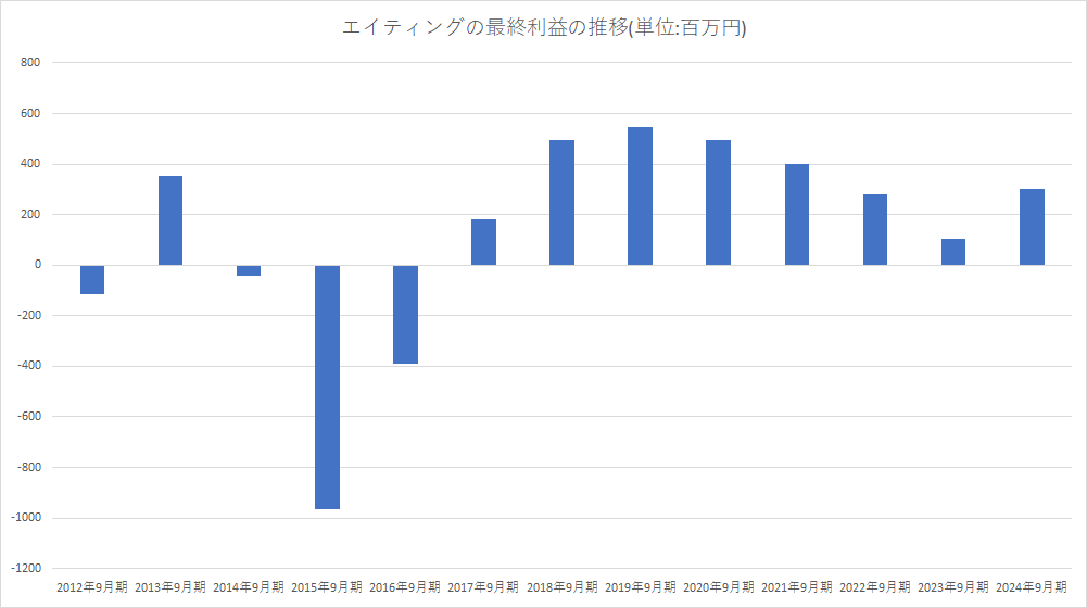 エイティングの2024年9月期(第12期)の決算は、最終利益が前の期比191.6%増の2億9900万円と大幅増益を達成した。これで8期連続の黒字となった。前の期(2023年9月期)の実績は、最終利益1億0200万円だった。1月22日付の『官報』に掲載された「決算公告」で判明した。