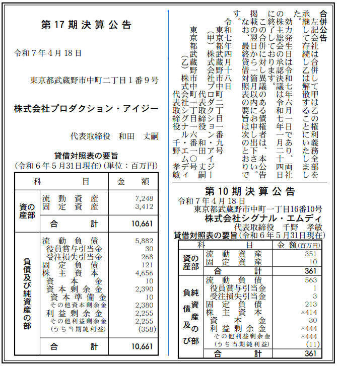 IGポート<3791>は、この日(1月24日)、連結子会社であるプロダクション・アイジーがグループ会社のシグナル・エムディを6月1日付で吸収合併すると発表した。シグナル・エムディは解散する。