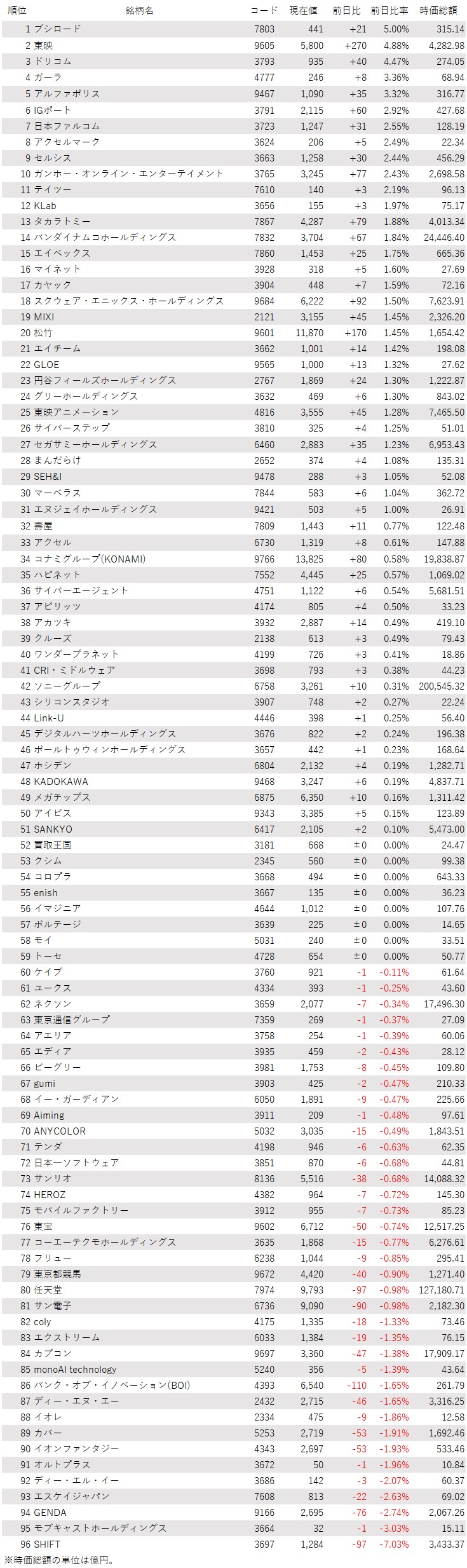 そうした中でゲーム・エンタメ関連株の動きを見てみると、下記の表に登録しているゲーム・エンタメ関連企業96銘柄のうち、上昇は51銘柄(53%)、下落は37銘柄(39%)、変わらずは8銘柄(8%)で、上昇した銘柄のほうが多かった。