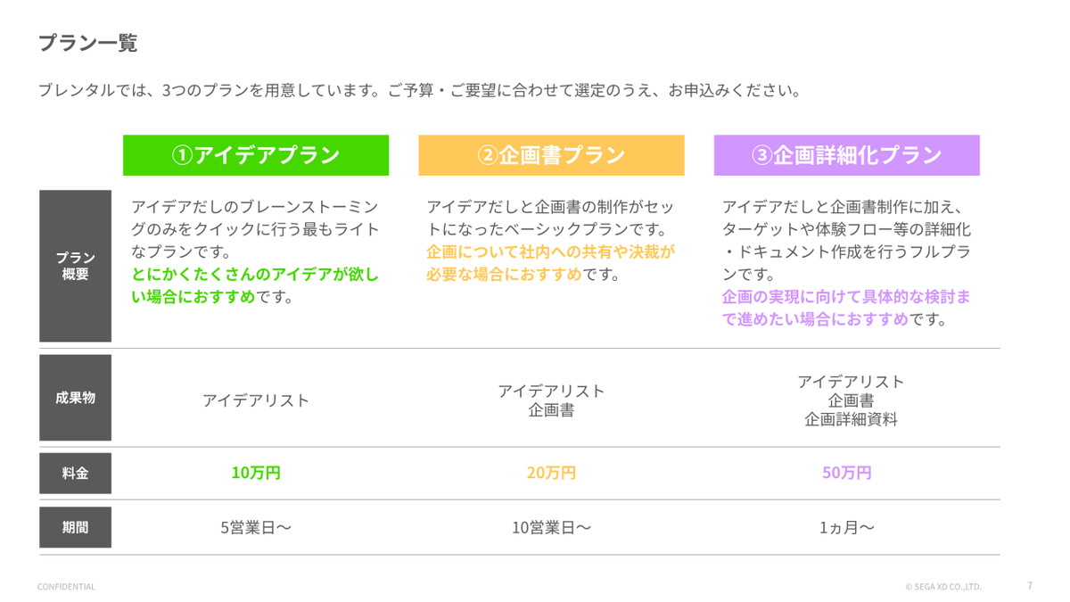 「ブレンタル」は、ブレーンストーミングでアイデア出しを行う「アイデアプラン」、企画書制作までを行う「企画書プラン」、より詳細なドキュメント制作までを行う「企画詳細化プラン」の 3 プランを用意している。